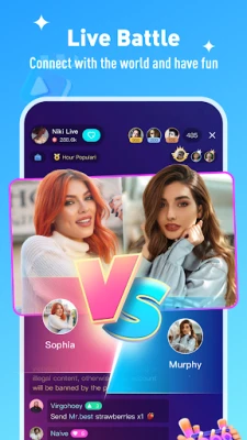 Shiga cikin farin cikin Niki Live kuma ka ji daɗin hulɗa ta kai tsaye tare da masu gabatarwa da sauran masu kallo. Ka halarci yaƙe-yaƙe na PK masu ban sha'awa tsakanin masu basira daga sassa daban-daban na duniya, inda goyon bayan ka ke da muhimmanci. Waɗannan dakunan jam'iyya suna ba da damar tattaunawa ta murya da mutane har guda 12, suna samar da yanayi mai aminci da walwala don gina sabbin abota. Niki Live na aiki awanni 24 a rana, kwana bakwai a mako, yana tabbatar da cewa ba za ka taɓa rasa wani muhimmin lokacin nishadi ba, tare da tarin masu gabatarwa masu ban sha'awa da ke shirye don nishadantar da kai.