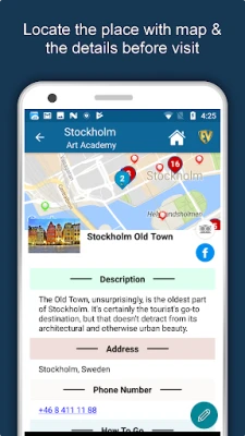 Bayan binciken al'adu, Stockholm Travel & Explore yana ba ka damar tsara tafiyarka dalla-dalla. Yana nuna maka Dalili, Yaushe da kuma Yadda za ka ziyarci wurare daban-daban a Stockholm, tare da ingantattun wurare a kan taswira. Za ka iya adana wuraren da kake so a cikin EduBank kuma ka samu cikakkiyar hanya zuwa gare su. Manhajar ta kuma haɗa da fasalin Street View, wanda zai ba ka damar ganin yadda wuraren suke a zahiri kafin ka isa. Ba wai kawai haka ba, za ka iya bayar da ra'ayinka da kimar gogewar ka bayan shiga, wanda zai taimaka wa sauran masu amfani a cikin al'ummar Stockholm Travel & Explore. Wannan haɗin kai yana tabbatar da ingantattun bayanai da ci gaba ga kowa.